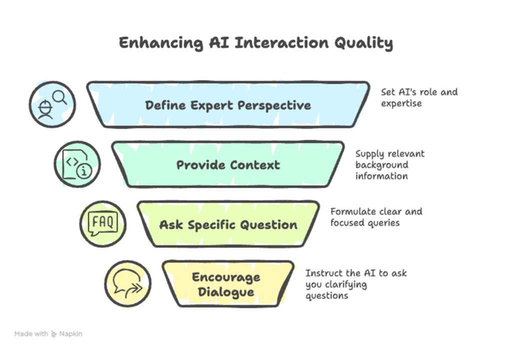 This step is consistently highlighted as the “most important part” of the framework.3 It involves explicitly instructing the AI to ask clarifying questions if it needs additional information before generating its final response.1 This proactive invitation for dialogue ensures an iterative improvement process, allowing the AI to refine its understanding, gather any missing details, and ultimately provide the best possible and most precise response.1 It critically reduces the risk of the AI making incorrect assumptions or “filling in the blanks” with potentially inaccurate information.13