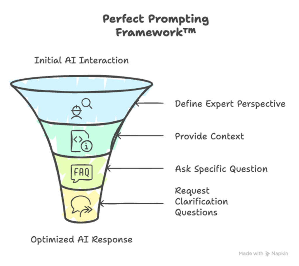 The Perfect Prompt Framework is a four-step methodology meticulously designed to achieve high-quality, actionable AI responses by structuring prompts around the key elements of Expertise, Context, Specificity, and Dialogue.1 This systematic approach is engineered to ensure precision, depth, efficiency, and consistency across a wide array of AI models.1